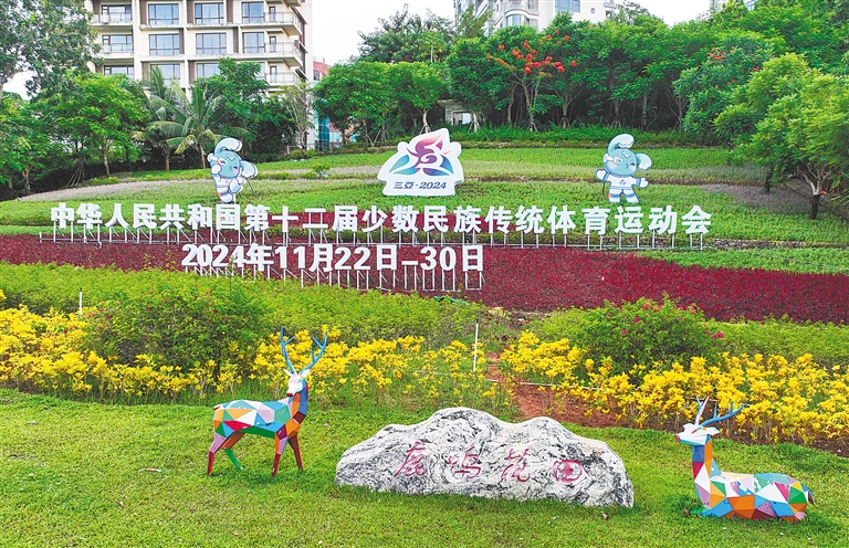 在三亞天涯海角游覽區等地游玩,相框式的海報吸引游客拍照留念;驅車前往三亞鳳凰國際機場,一幅寫有“當好東道主,全民迎盛會”的巨幅海報映入眼簾;在育新路與鹿城大道交會口,以運動會為造型的繽紛立體綠植賞心悅目……