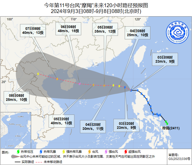 海南省氣象局2024年9月3日9時30分發布臺風四級預警:今年第11號臺風“摩羯”(熱帶風暴級),8時其中心位于北緯18.2度、東經119.7度,也就是位于菲律賓呂宋島西北部近海,中心附近最大風力9級(23米/秒),中心氣壓995百帕。預計,“摩羯”將以每小時10-15公里的速度向偏西方向移動,即將進入南海東部海面,爾后向海南島以東海面靠近,強度逐漸加強,最強可達強臺風級或超強臺風級(48-58米/秒,15-17級),并將于6日中午到夜間在海南島東部到廣東西部一帶沿海登陸。