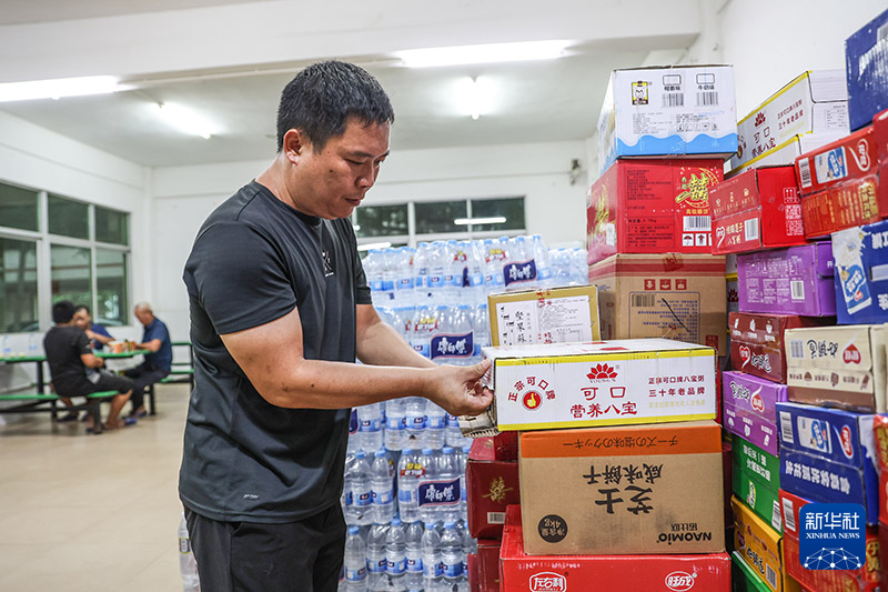 工作人員在明月小學集中安置點整理物資。新華社記者張麗蕓 攝
