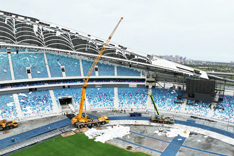 面對重重困難,??谖逶春芋w育場修復工程正在緊鑼密鼓開展,確保9月15日坎耶·維斯特世界巡回試聽會-??谡救缂s開演。