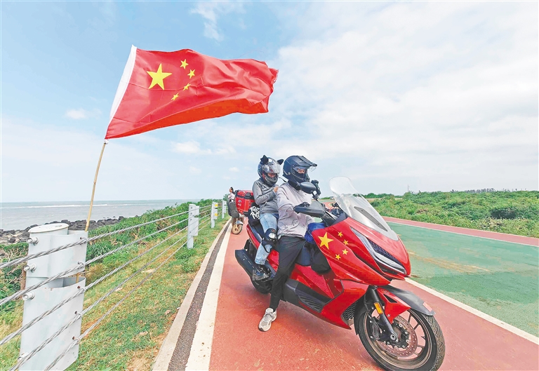 十月二日,在海南環島旅游公路儋州市火山海岸地質公園段,騎行愛好者停車打卡。海南日報全媒體記者 陳元才 攝