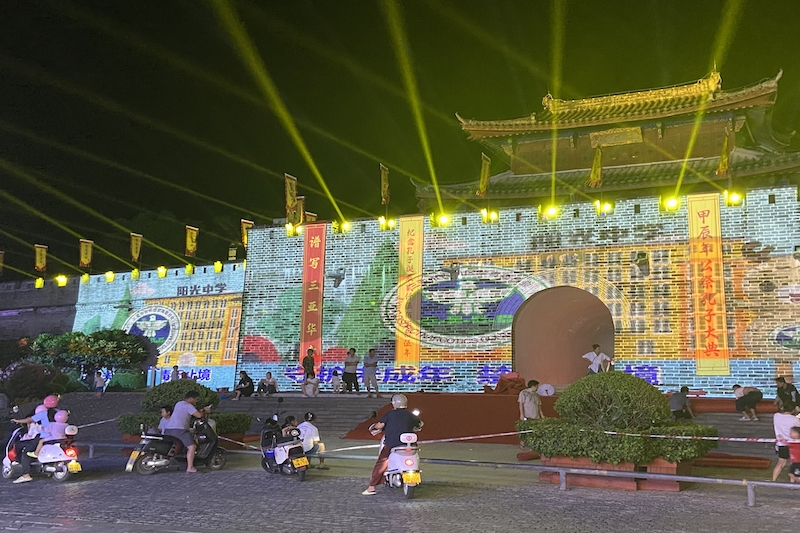 在燈光秀的映襯下,崖州區古城門被點綴得五彩斑斕,禁毒宣傳標語在古城墻上熠熠生輝,形成了一幅幅生動畫卷。市民游客們在欣賞美景的同時,還能手持印有“崖州禁毒”字樣的團扇,親身體驗非遺漆扇、畫扇的精湛技藝,感受傳統文化的魅力。
