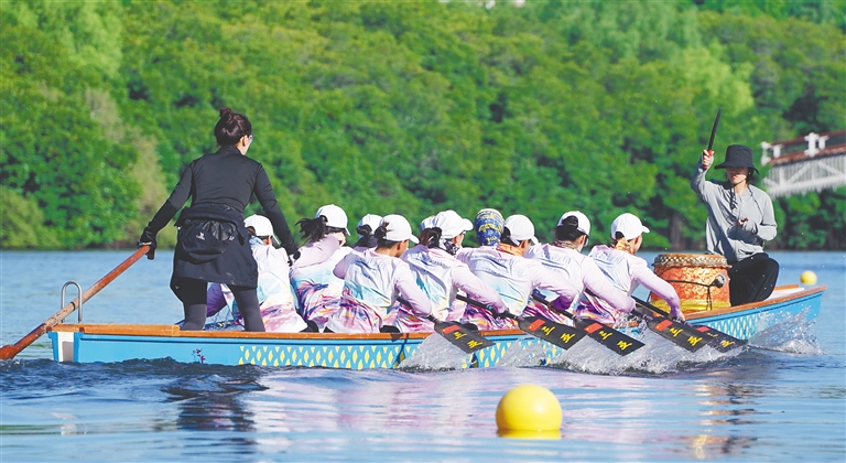 運動會龍舟項目海南代表隊(女隊)在三亞河上備賽。通訊員 陳曉旅 攝