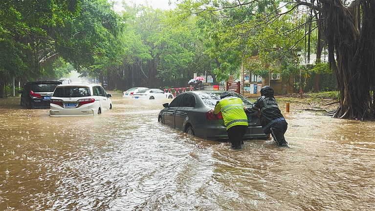 十月二十八日上午,三亞警方幫助市民將拋錨車輛推離積水區域。海南日報全媒體記者王程龍攝