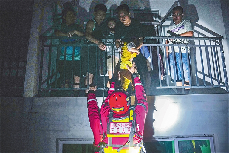 10月28日晚,三亞市金頂小區內澇嚴重,三亞消防員轉移受困群眾。海南日報全媒體記者 王程龍 攝