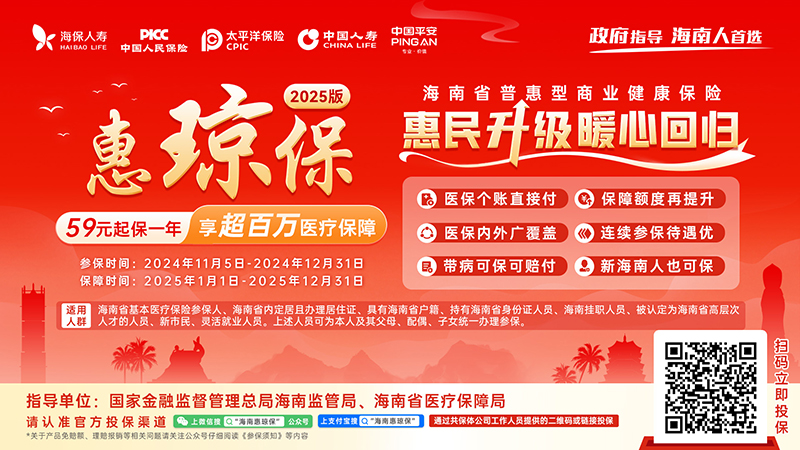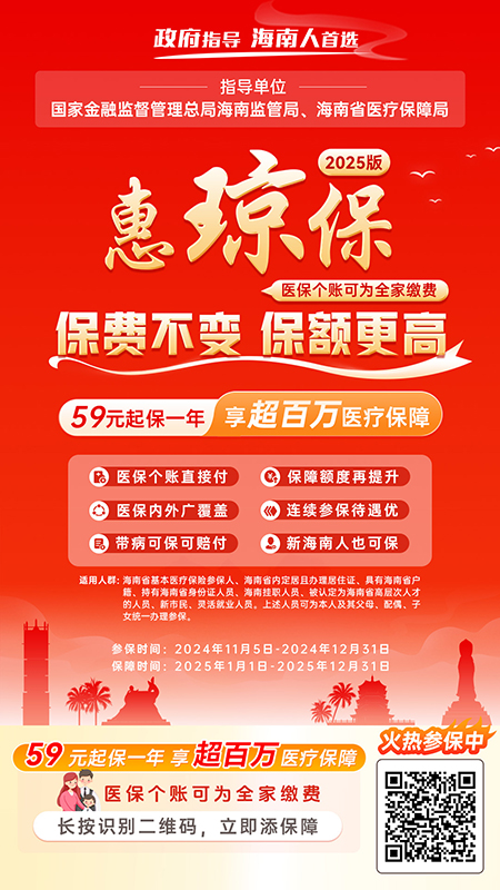 即日起,海南人民可關注官方投保平臺“海南惠瓊?!蔽⑿殴娞?,為本人及家人進行投保。參保期截至2024年12月31日,保障期為2025年1月1日至12月31日。