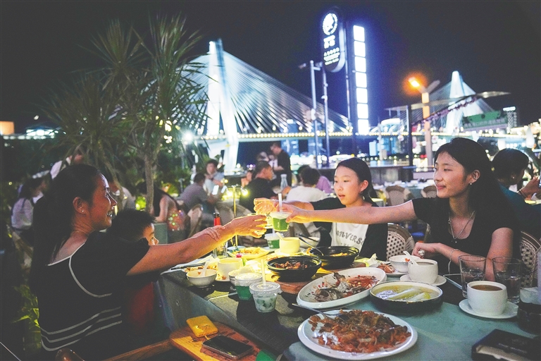 在??跒惩鉃┮徊蛷d,市民游客一邊欣賞世紀大橋夜景,一邊用餐。海南日報全媒體記者 王程龍 攝