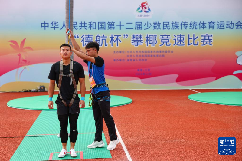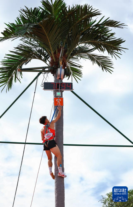 新華社三亞11月23日電(記者周慧敏、田光雨)你爬過樹嗎?你能想象爬樹也能成為比賽項目嗎?23日,作為第十二屆全國少數民族傳統體育運動會的新增競賽項目,攀椰競速比賽在三亞拉開帷幕,上演椰子樹上的“速度與激情”。