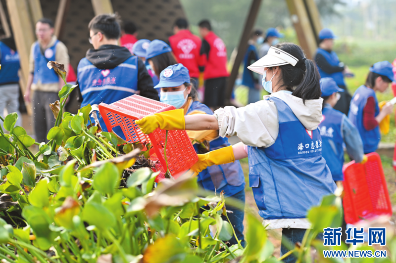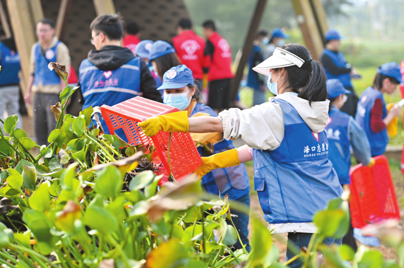 志愿者清理路邊綠化帶內的垃圾和落葉。海南省委文明辦供圖