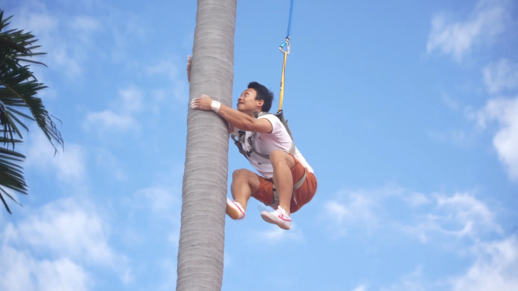 本次攀椰競速賽分男子9米和女子7米兩項,選手需在仿真椰子樹上進行攀爬,自選攀爬動作爬到樹頂觸鈴,用時最短者獲勝。