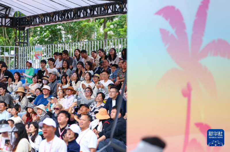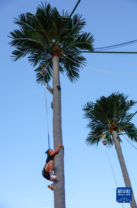 賽場上,幾棵筆直高聳的仿真椰子樹頂端懸掛著計時器。計時鈴聲響起,運動員們箭步沖刺,輕快地躍上樹干,手腳并用奮力向上攀爬,動作流暢而快速,在短短幾秒鐘內便登頂完成挑戰,引來觀眾的嘖嘖稱贊。
