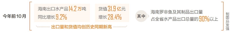 今年以來,海南水產品出口數據持續飄紅,彰顯外貿活力。??诤jP11月25日公布數據顯示,前10月,海南出口水產品14.2萬噸,同比增長9.2%;貨值31.9億元,增長28.4%,出口量和貨值均創歷史同期新高。