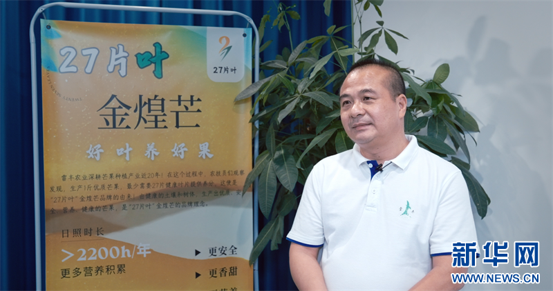 雷豐芒果負責人介紹今年新推出的“27片葉”品牌。新華網發(曾振剛 攝)
