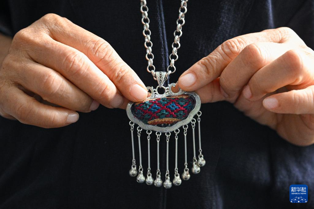 黎族織娘在位于海南省東方市東河鎮的家中展示含有黎錦元素的吊墜(2023年6月7日攝)。新華社記者 蒲曉旭 攝