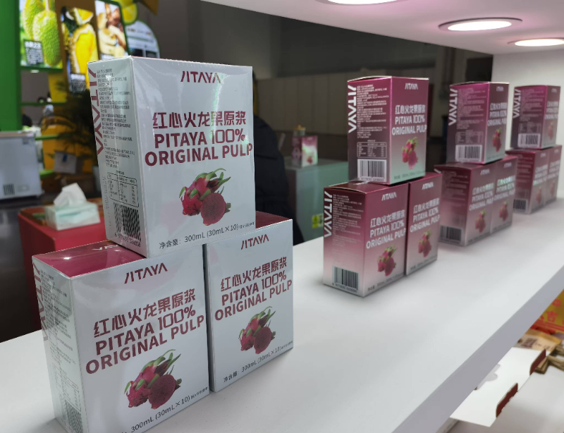 在冬交會海南火龍果產業展館內,海南際元生物科技有限公司董事長康寧介紹,今年第一年參加冬交會,沒想到公司與科研機構合作推出的“火龍果原漿”產品備受市場認可。