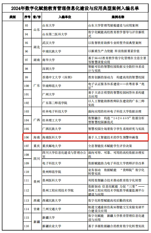 近日,教育部公布了2024年數字化賦能教育管理信息化建設與應用典型案例入編名單,全國本科高校的58個案例入選。由海南醫科大學現代教育技術中心黃斌文、陳靜嫻、吳京朋撰寫的“基于人工智能技術的學生預警和畫像”應用成功入選,并成為海南省唯一入選的優秀案例。