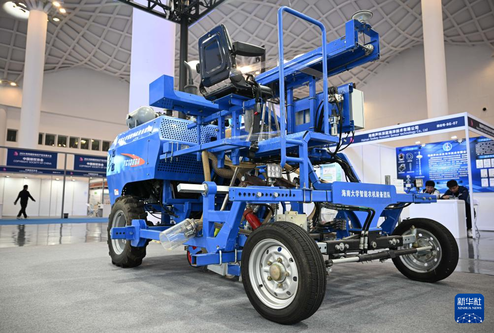 12月20日在2024海南國際知識產權交易大會現場拍攝的谷物(玉米)自走式小區精播機。新華社記者 蒲曉旭 攝