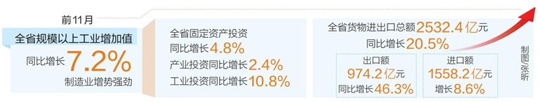 固定資產投資方面,前11月全省固定資產投資同比增長4.8%。產業投資同比增長2.4%,工業投資增勢良好,增長10.8% ,較前10月提升1.1個百分點,高于全部投資增速6個百分點。房地產開發投資增長3%,基礎設施投資(不含電力、燃氣及水的生產和供應業)增長12.8%,公共服務投資增長1.7%。
