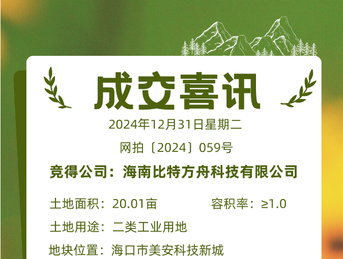 據??趪腋咝聟^管委會消息,12月31日,海南比特方舟科技有限公司、農夫山泉(???火山飲料有限公司、海南東鵬食品飲料有限公司三家企業競得??趪腋咝聟^美安生態科技新城四宗地,總面積逾462畝。