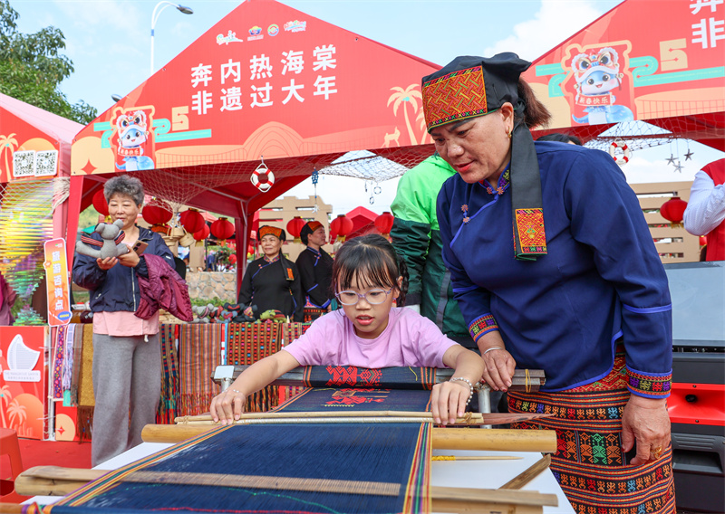 除了豐富的年貨和美食,“非遺技藝秀”專區成為了此次年貨節的一大亮點。今年適逢我國首個“非遺版”春節,主辦方特別邀請了多位本地非遺傳承老師坐鎮,現場展示黎錦、藤編、椰雕等傳統手工藝品的制作以及竹木樂器的演奏,老師們精湛的技藝和獨特的作品吸引了眾多市民游客駐足觀看,許多市民在專業老師的指導下,體驗了簡單的手工藝品制作和樂器試奏?,F場,來自三亞傳媒影視集團的主持人擔任非遺講解員,為觀眾介紹非遺作品背后的故事和文化內涵,更有非遺有獎競猜環節和竹竿舞互動、瓊劇經典呈現等非遺文化展演,讓市民游客切實感受到非遺文化的魅力。主辦方還邀請多位書法家在現場揮毫潑墨,通過“中國書法”這一非遺文化為市民游客送上春聯和福字,傳遞新春祝福和美好愿景。在互動游戲區,猜燈謎、投壺、套圈等傳統游戲也趣味回歸,為市民游客帶來別樣的新春體驗。