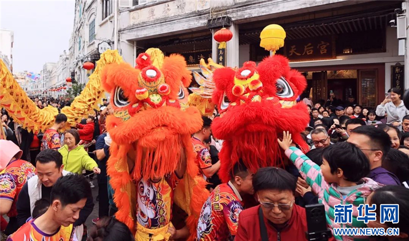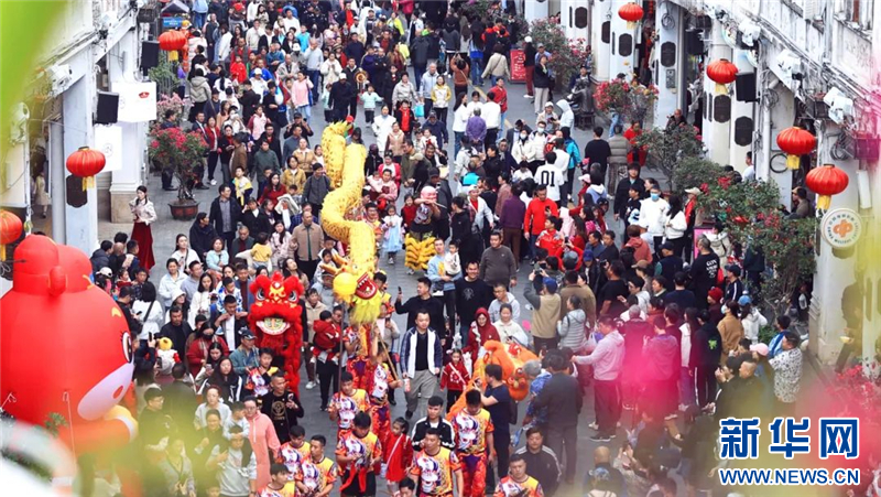 在騎樓老街舉辦的“龍獅賀春”民俗展演活動,得到眾多市民游客朋友們的歡迎和喜愛。伴隨著激昂的鑼鼓聲不斷,龍獅隊伍展示絕技,現場觀眾掌聲不斷、喝彩不停。不少市民游客上前互動,沾沾新年好運氣。