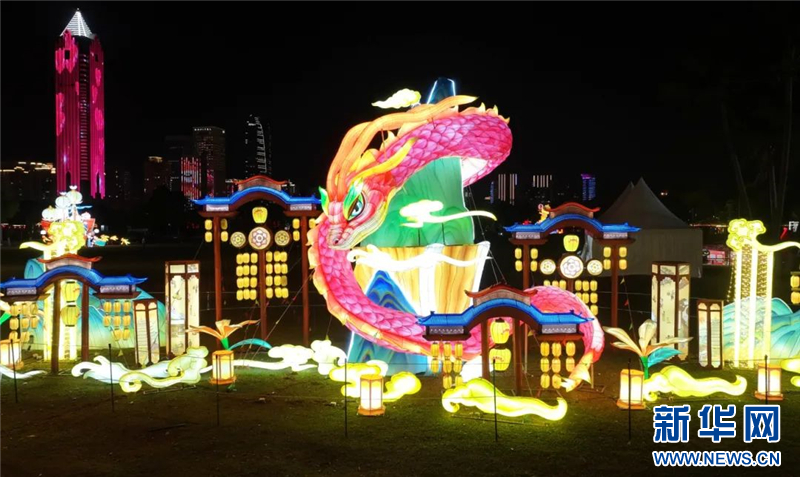 夜幕降臨,??谌f綠園瞬間變身璀璨星河,一盞盞造型別致、色彩絢麗的彩燈與樓宇燈光相得益彰,如夢如幻。春節期間,2025??谌f春會,融合了時尚元素、科技潮玩等彩燈藝術,打造了41組彩燈,既有以蛇年新春祝福為主題的“蛇年納?!睙艚M,也有融合國潮元素的“上元燈火”和“國潮福運”燈組,為全區人民呈上了一場彩燈盛宴,營造了濃厚的節日氛圍,讓市民游客在歡樂祥和的氛圍中迎接新年。