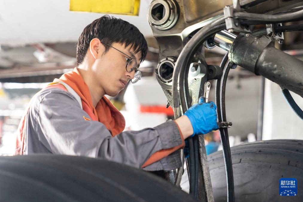 2月17日,在海南自貿港一站式飛機維修產業基地,海航技術旗下大新華飛機維修服務有限公司工作人員對進境飛機進行檢修。新華社記者 張麗蕓 攝