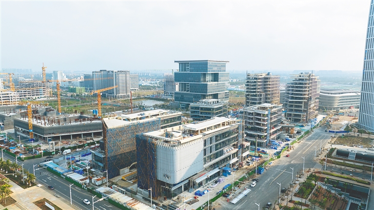 2月17日,航拍??诮瓥|新區江東天地項目建設現場。目前該項目工程總體進度已完成72%。據了解,江東天地項目建成后將成為集城市精品商業、文化娛樂、藝術展示、高端辦公等為一體的城市綜合體項目,完善江東新區城市功能。海南日報全媒體記者 袁琛 攝