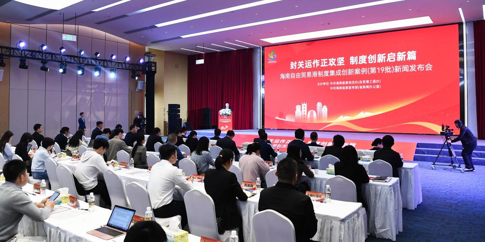 這是2月19日拍攝的海南自由貿易港制度集成創新案例(第19批)新聞發布會現場。當日,海南自由貿易港制度集成創新案例(第19批)新聞發布會在??谂e行,加工增值內銷免關稅政策從“試驗點”到“試驗田”等6項案例入選這批案例。新華社記者 楊冠宇 攝