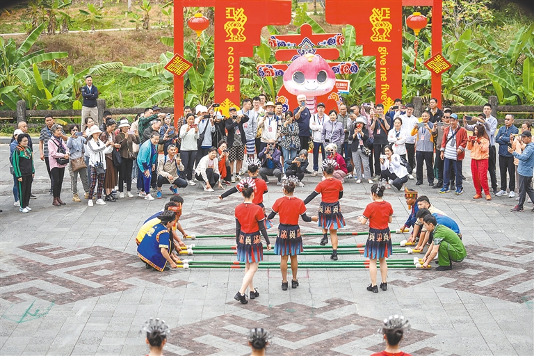 2月19日,游客在五指山市水滿鄉毛納村觀看竹竿舞演出。海南日報全媒體記者 李天平 攝
