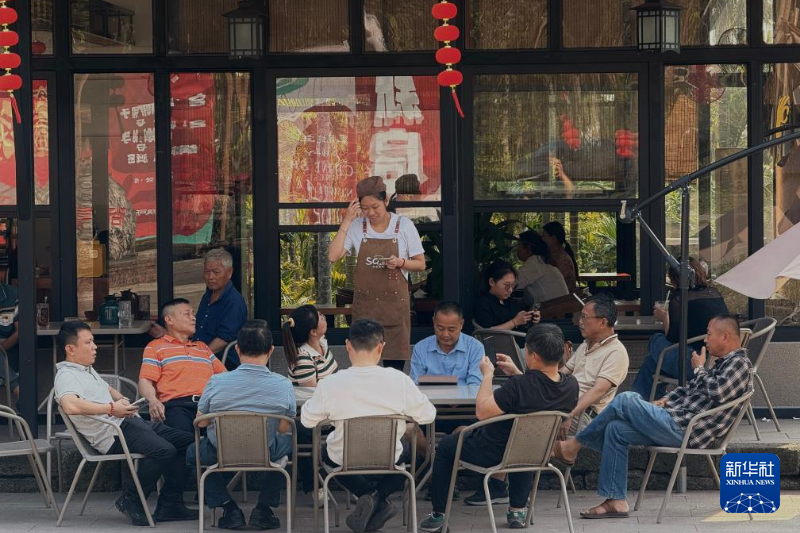 2025年3月5日,當地村民作為服務員在九所會客廳為顧客點單。新華社記者 陳子薇 攝
