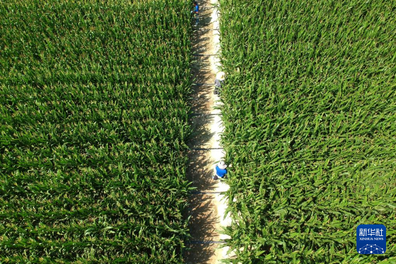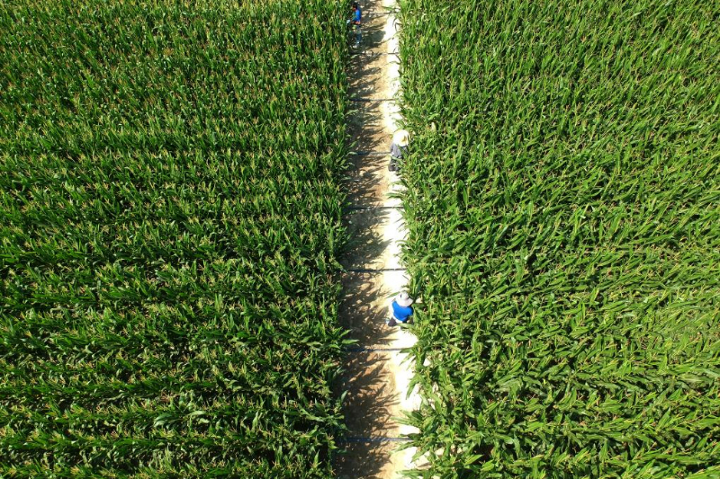 2月10日,在三亞市崖州灣科技城,隆平生物技術(海南)有限公司的科研人員在科研玉米地里工作(無人機照片)。新華社記者 趙穎全 攝