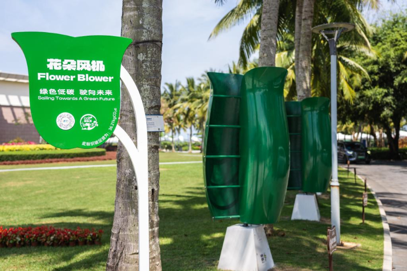 這是2024年3月27日拍攝的博鰲近零碳示范區內的花朵風機?;ǘ滹L機用來收集風能,是島內可再生能源利用項目之一。新華社記者 曹夢瑤 攝
