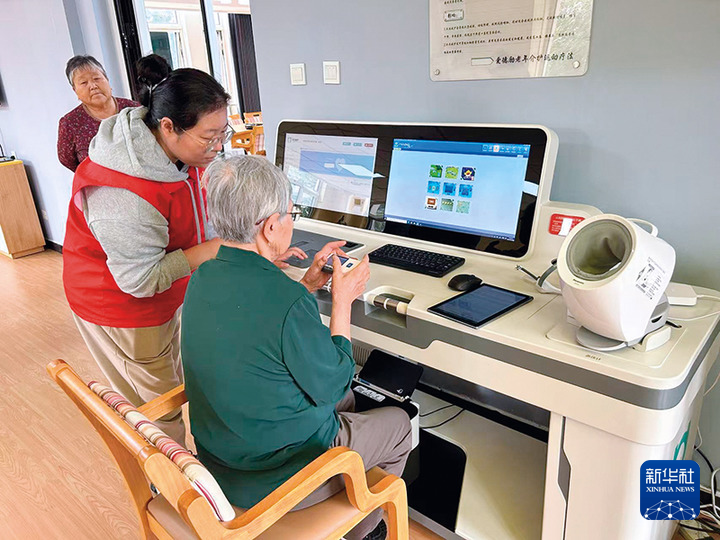 老人在天津市東麗區金橋街道綜合養老服務中心使用智能設備進行身體檢查。新華社記者 尹思源 攝