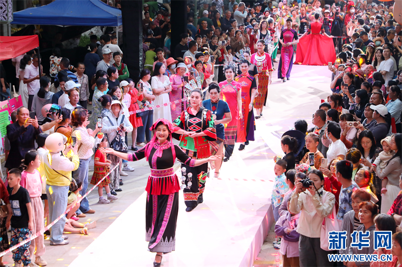 在五指山市解放路鴻鑫農貿市場旁,階梯鋪設布毯,巧妙搭建成走秀“T臺”,道路兩旁的香樟樹撐起了成片林蔭,一場黎錦非遺民族時裝“村秀”在城市主街區盛放,成為全城狂歡活動中的生動一幕。