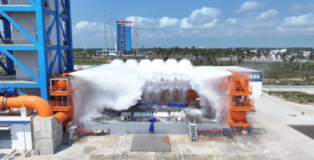 中國航天科技集團專家介紹,該系統在火箭起飛后立即啟動,以27噸/秒的流量向箭體尾部火焰中心噴射扇形水幕。與此同時,一級噴水系統以6噸/秒的流量在發射平臺導流槽形成保護水霧,二者協同配合,預計可將燃氣流溫度降低80%以上。噴水降噪系統可有效吸收聲波能量,大幅度減輕火箭發射時產生的高溫和噪音對發射設施的損害。