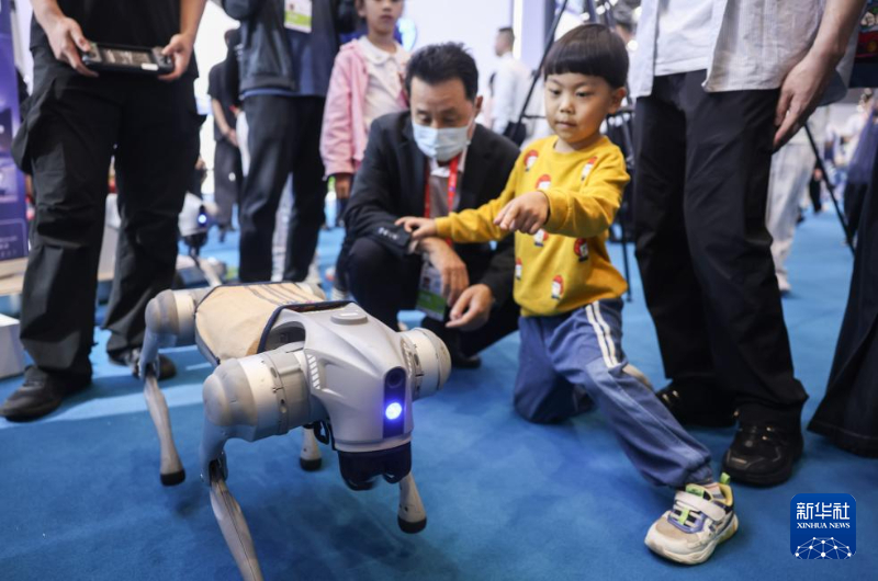 觀眾與宇樹科技的機器狗進行互動。新華社記者 張麗蕓 攝