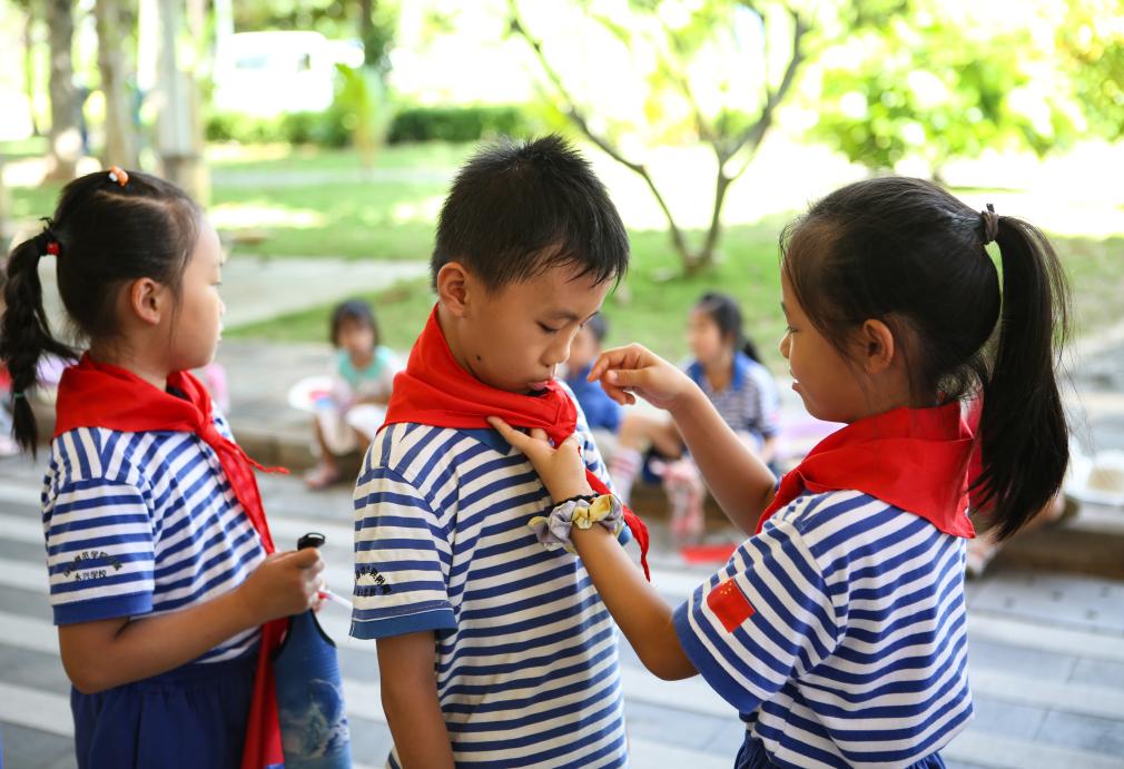 海南省三沙市永興學校的少先隊員們在“童心向祖國,我為祖國獻首歌”活動中佩戴紅領巾。(資料照片)新華社記者 樊雨晴 攝