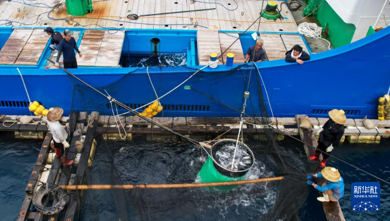 日本籍漁船在海南省萬寧市附近海域裝運章雄魚苗(5月15日攝,無人機照片)。