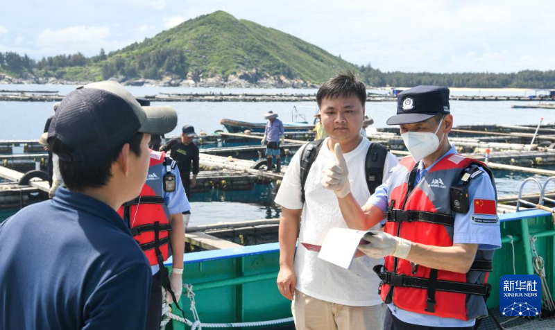 在海南省萬寧市附近海域的一艘日本籍魚苗船上,??诔鋈刖尺叿罊z查總站秀英邊檢站移民管理警察對船員進行人證對照(5月15日攝)。