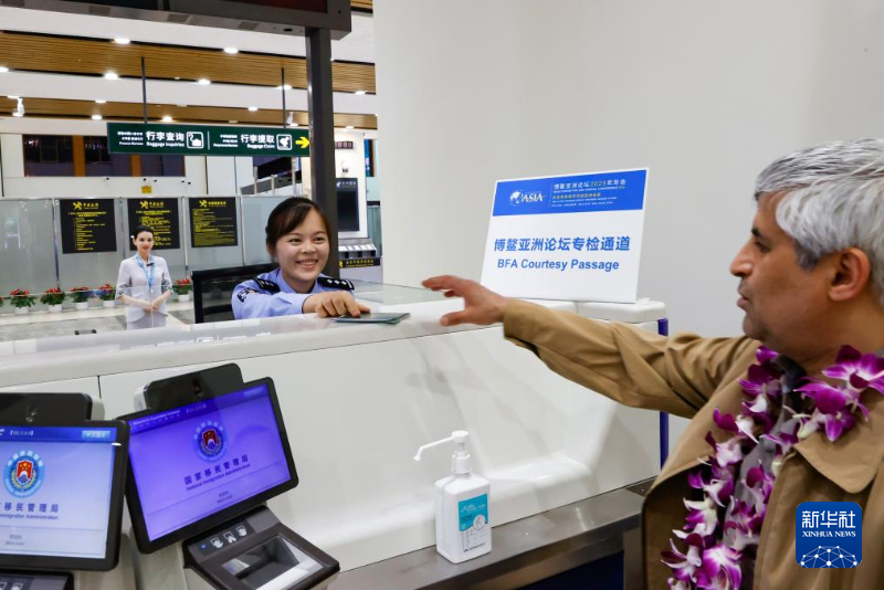 在海南瓊海博鰲國際機場,??诔鋈刖尺叿罊z查總站博鰲邊檢站(籌)移民管理警察為參加博鰲論壇年會嘉賓辦理入境手續(3月23日攝)。