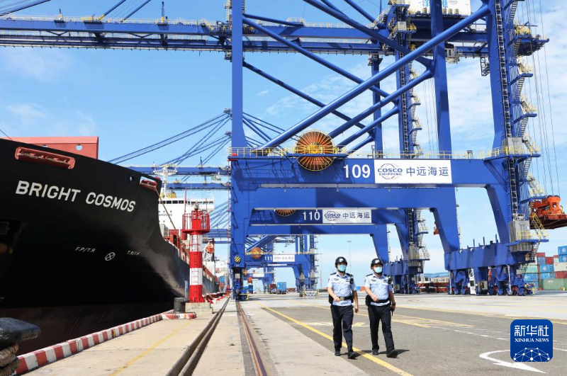 ??诔鋈刖尺叿罊z查總站洋浦邊檢站移民管理警察在海南洋浦國際集裝箱碼頭巡查(5月28日攝)。