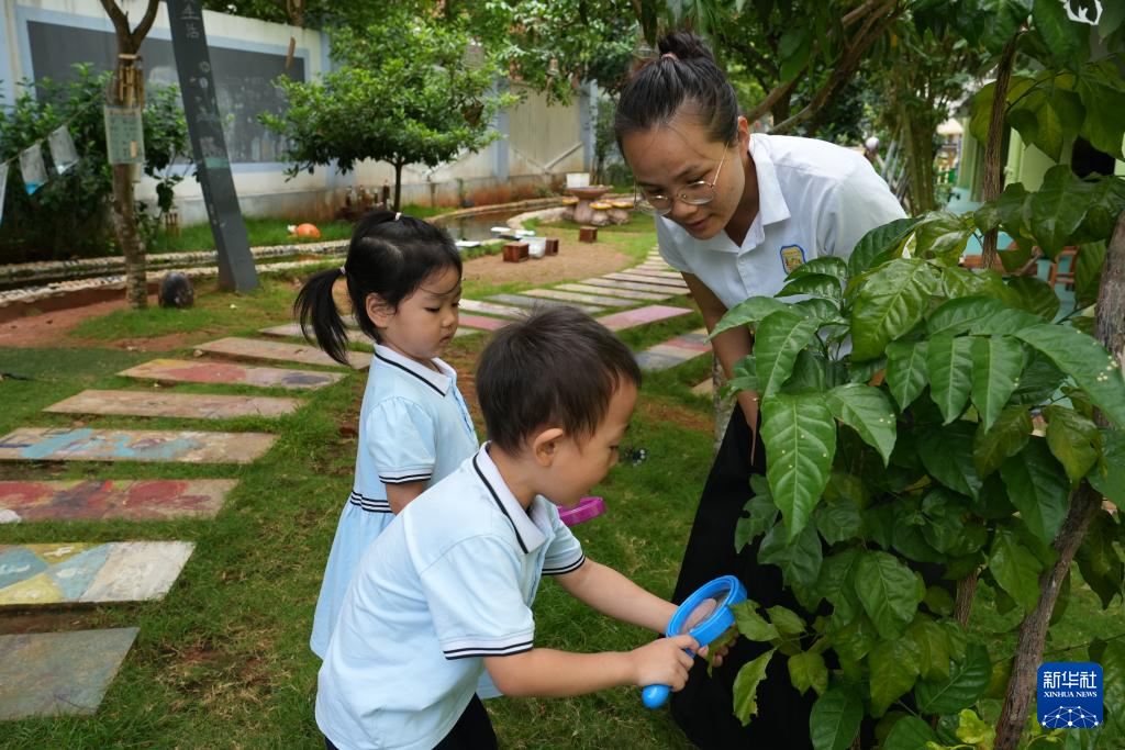 這是??谑薪逃變簣@的戶外游戲區,幼兒們正在觀察植物。新華社記者 夏天攝
