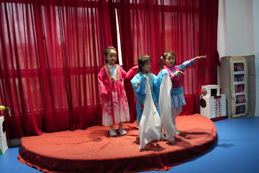 在??谑薪逃變簣@“騎樓老街”微縮景觀游戲區,幼兒們正在戲臺上模仿表演瓊劇。新華社記者 夏天 攝