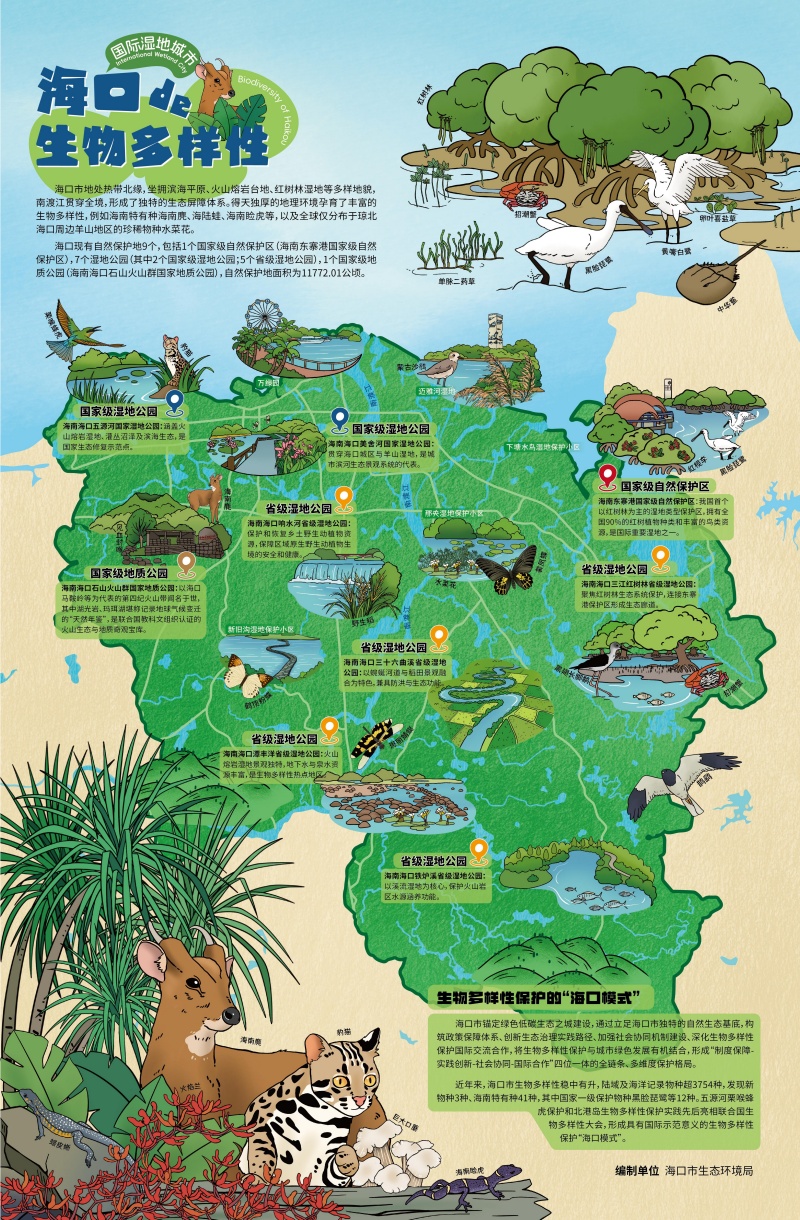 該地圖正面繪制???大生態保護地、重要生態熱點地區及典型物種分布,包括海南東寨港國家級自然保護區、海南??谖逶春訃覞竦毓珗@、海南??诿郎岷訃覞竦毓珗@等;背面則標注了??谑猩锒鄻有灾饕獢祿?、7大類52種典型物種,形成市民自然探索手冊。