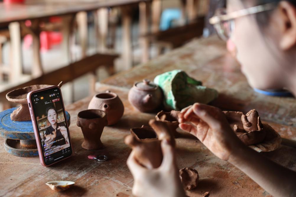 6月9日,在海南三亞黑土黎陶合作社里,村民董佳佳用直播方式線上銷售黎陶產品。