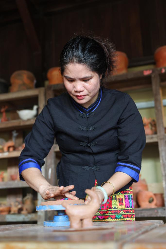 6月9日,在海南三亞黑土黎陶合作社里,村民董良姨制作黎陶。