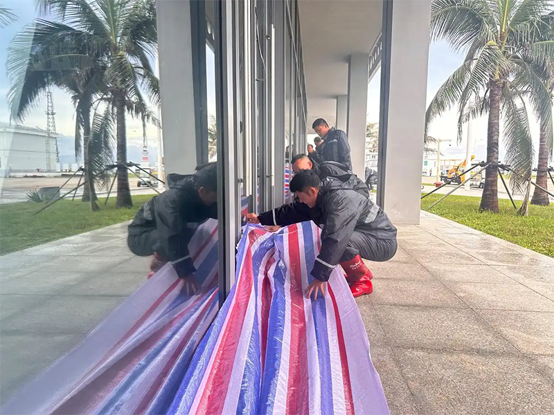 6月11日,三沙市工作人員正在對文體館進行防風防汛處理。(三沙市新聞中心供圖)