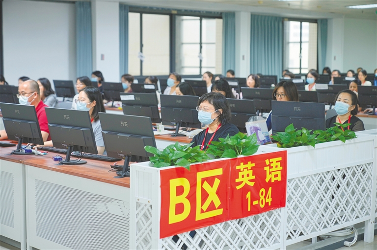 進入評卷場,記者看到,入口處有安保人員值守,所有人員入場須憑有效證件,并通過智能安檢門、人工安檢兩道關口,禁止攜帶手機等通信設備。評卷場內,評卷教師們坐在電腦前專注地評閱,鍵盤聲此起彼伏;張貼在醒目位置的“科學公正、量分合理”“寬嚴適度、前后一致”等標語映入眼簾,現場秩序井然。