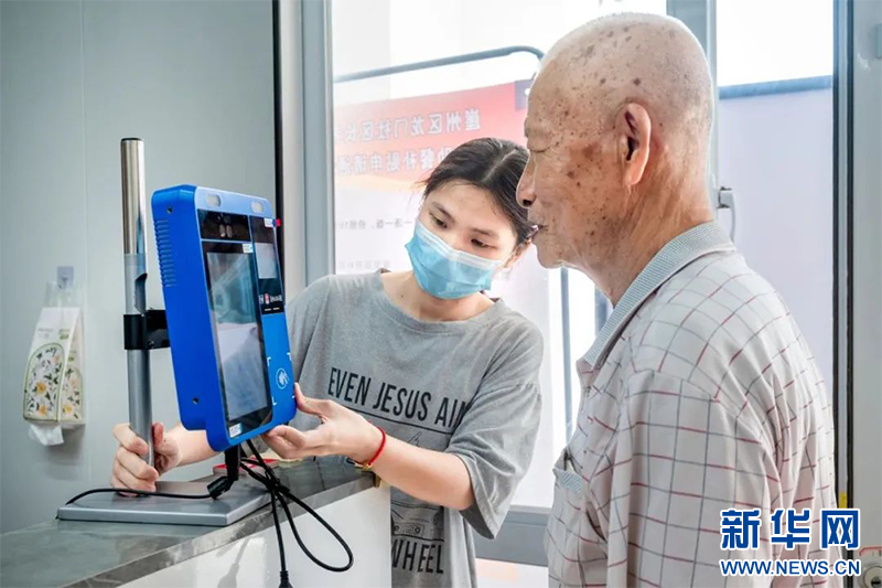 老年人在工作人員的引導下通過人臉識別完成就餐結算。新華網發